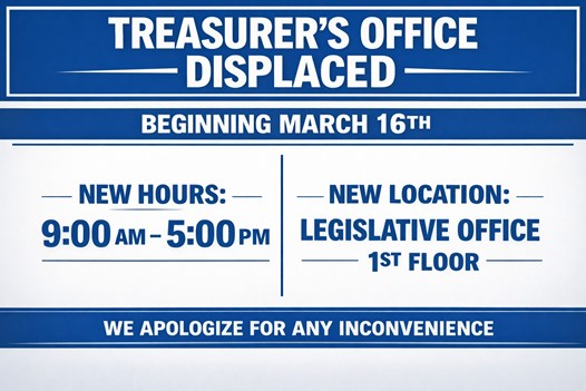 Please be advised that the Treasurer’s Office will be temporarily displaced due to scheduled construction. This displacement is tentatively planned to occur from March 16 through April 10. During this period, the office will remain fully available to assist both in person and by phone, and all daily processes are expected to continue without interruption. We appreciate your understanding and cooperation throughout this temporary transition.